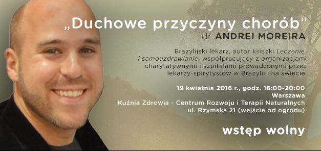 Zapraszamy na wykład „Duchowe przyczyny chorób”, który wygłosi dr Andrei Moreira, brazylijski lekarz, autor książki „Leczenie i samouzdrawianie”, współpracujący z organizacjami charytatywnymi i szpitalami prowadzonymi przez lekarzy-spirytystów w Brazylii i na świecie.